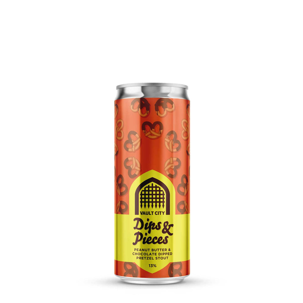 Vault City Dips & Pieces ist ein 13% ABV Imperial Pastry Stout, gebraut in Edinburgh, Schottland. Inspiriert von schokoladenüberzogenen Erdnussbutter-Brezelstücken, verfügt es über eine reichhaltige Malzmischung aus Carafa Special III, Melanoidin, Schokoladenmalz, Weizen und Hafer. Klebrig und vollmundig liefert es intensive Röstschokoladenaromen, kombiniert mit cremiger Erdnussbutter und einer dezenten Salznote. Dick, samtig und dessertartig, ist dieses Stout indulgent und nussfrei, ideal für Liebhaber von Pastry Stouts.